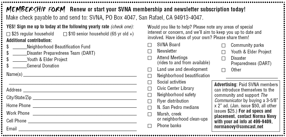 SVNA membership is $25 per year ($10 per year for seniors) and helps the Organization to produce our newsletter (The Communicator) as well as fund neighborhood projects. SVNA projects include neighborhood beautification, bi-monthly community meetings, the bi-monthly newsletter, and more. We use the newsletter to keep the members informed (we welcome articles by members of the organization) and we host community meetings as information forums and to allow for input from the members. We believe in strength in numbers. $25 per year is not too much to spend for that support. If you have not paid your membership fees for the new year, a printable membership form is provided for your use. Please complete this form and mail it with your check |
